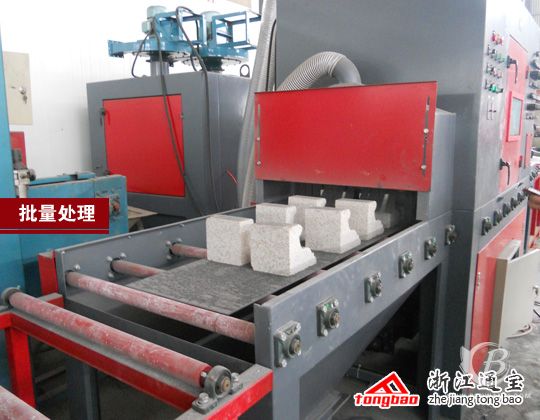 杭州通寶機械:某公司定購的非標(biāo)型石材輥道通過式噴砂機目前已交付使用;設(shè)備采用輥道滾軸式傳輸原理,機身單軸配置串聯(lián)式獨立鏈條齒輪,運轉(zhuǎn)更平穩(wěn)。工作艙內(nèi)部采用10把高效能噴槍,自動搖擺式噴砂作業(yè),處理更全面,同時體現(xiàn)了“升級表面 輕松擁有”的口號。